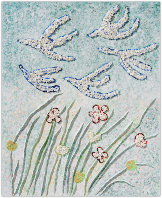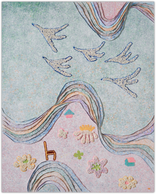작가는 과거와 현재, 미래가 뒤섞인 유희의 시간을 파스텔 색조로 채색하며, 그 위에 물감을 입체적으로 쌓아 올려 손에 잡힐 듯 생생한 꿈의 조각들을 만들어냅니다.